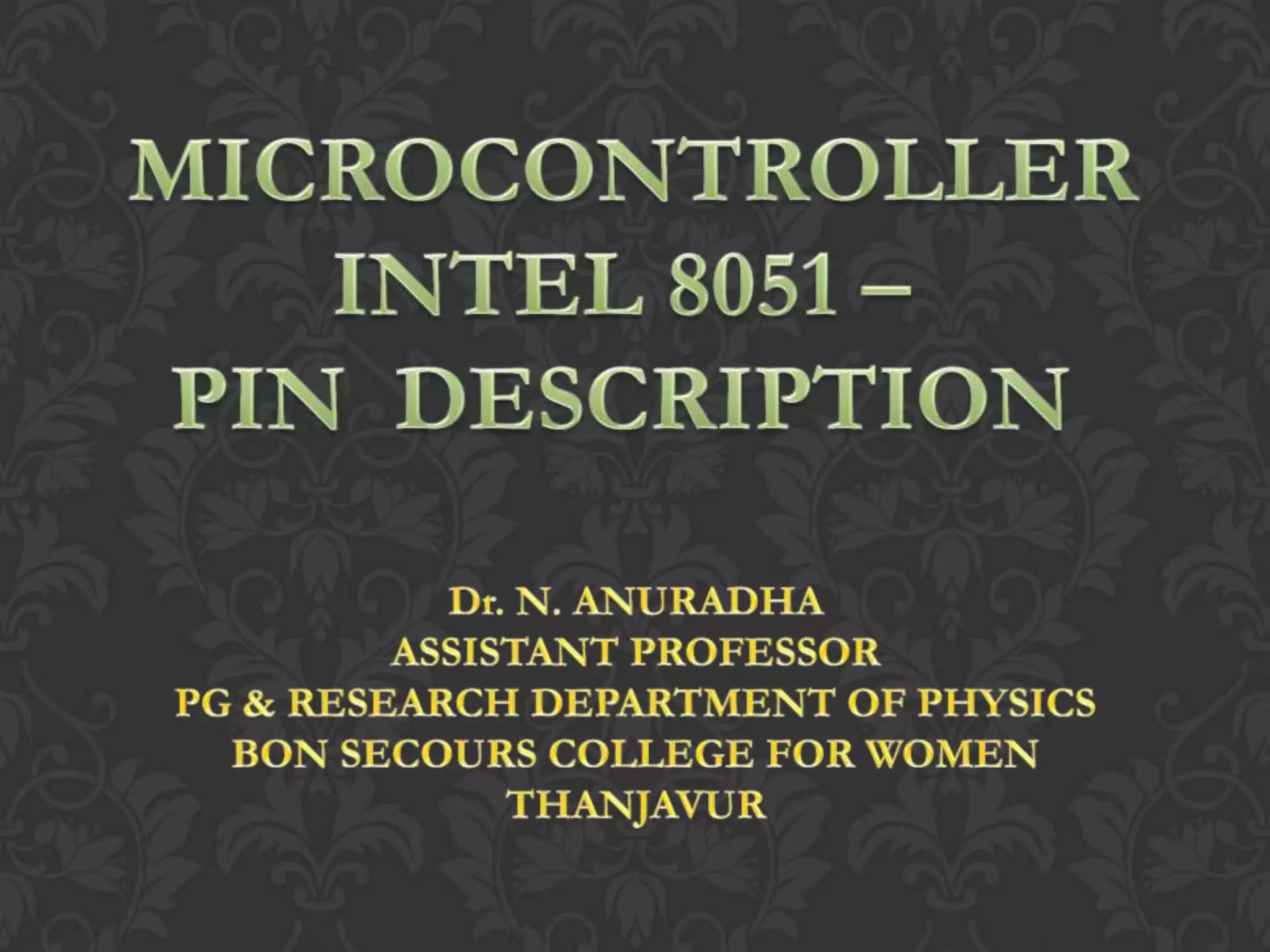 The 8051 microcontroller has 40 pins, 32 of which are used for input/output across 4 ports (P0, P1, P2, P3). Ports P0, P2, and P3 have pins that are multiplexed for address/data functions when accessing external memory, but otherwise function as I/O pins. The remaining pins are used for power (VCC, GND), oscillators (XTAL1, XTAL2), resets (RST), and enabling access to external devices (ALE, PSEN, EA).