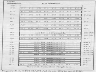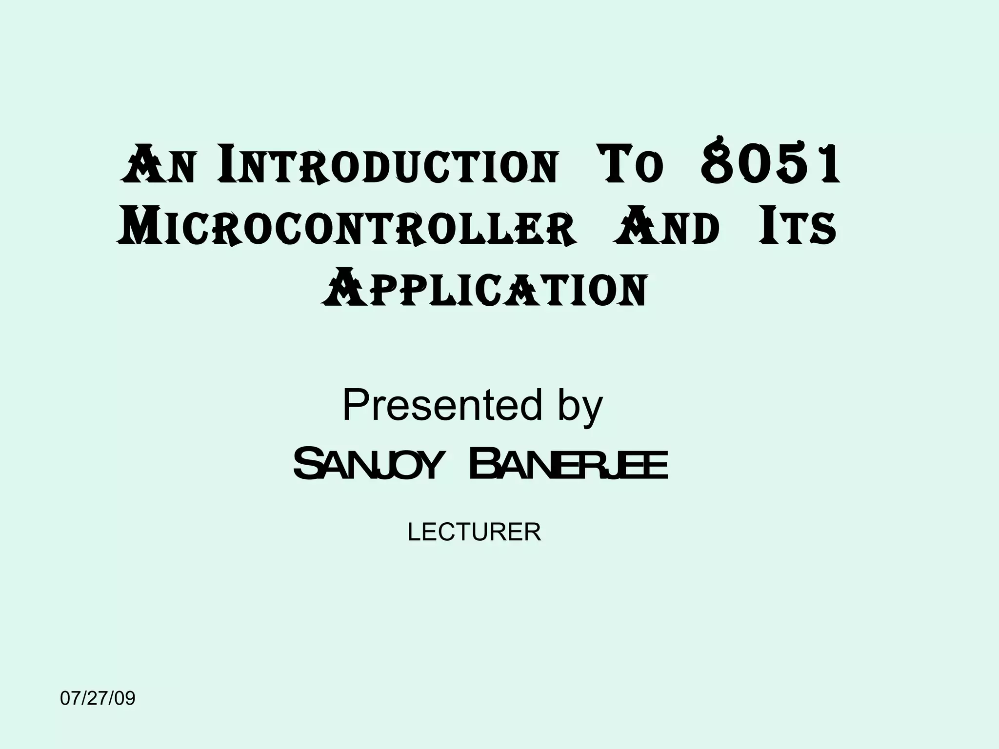 The document provides an introduction to the 8051 microcontroller and its architecture, detailing its hardware components, functionality, and differences compared to microprocessors. It describes various microcontroller types, such as 4-bit, 8-bit, and 16-bit, along with their applications and characteristics. Additionally, the document covers the internal structure, ports, registers, and instruction set of the 8051, highlighting its suitability for embedded systems due to its cost-effectiveness and compact design.