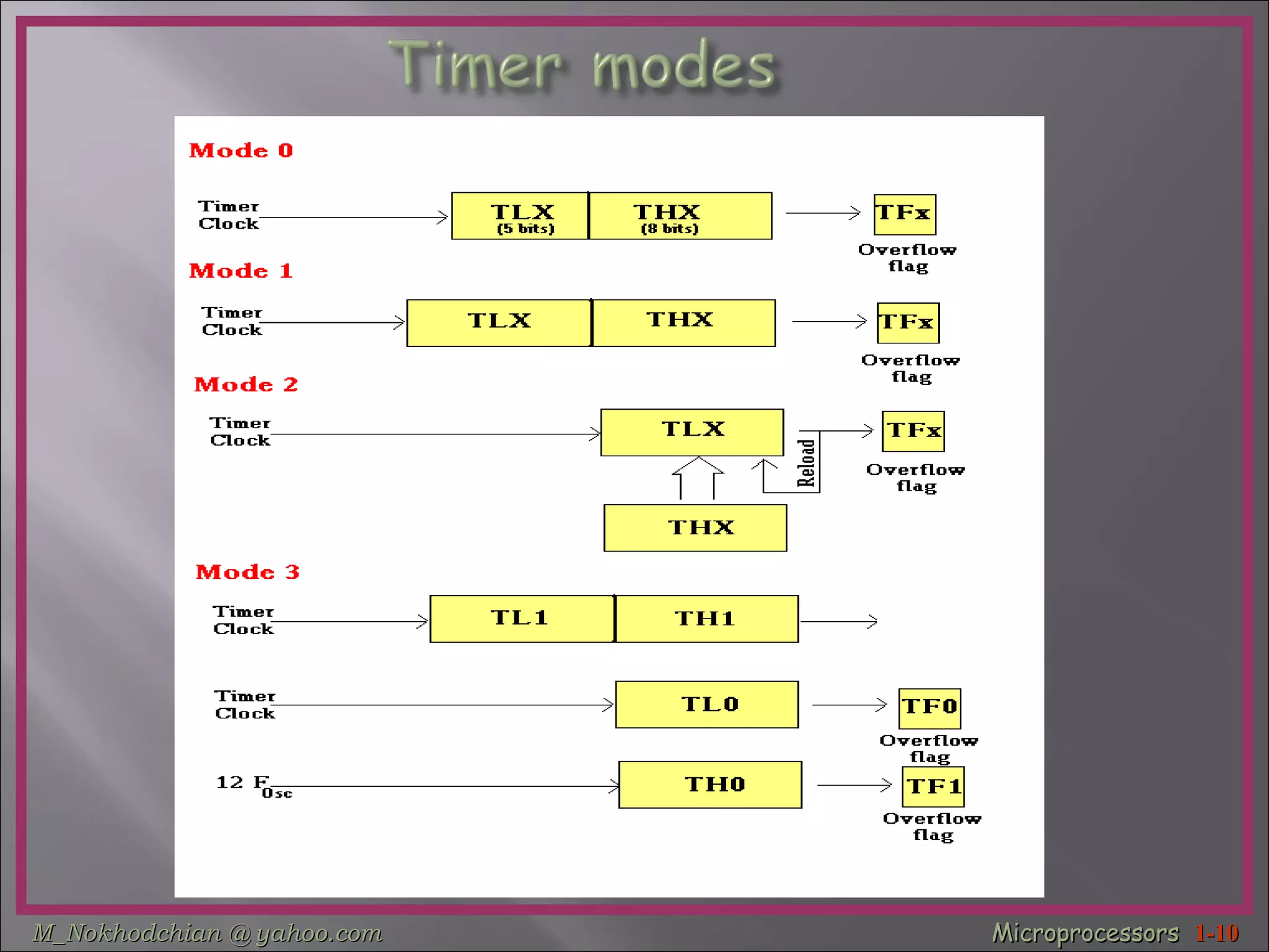 C/T Timer or counter selected cleared for timer operation (input from internal system clock). Set for counter operation (input from Tx input pin). M1 M0 Mode Operating Mode 0 0 0 13-bit timer mode 8-bit THx + 5-bit TLx (x= 0 or 1) 0 1 1 16-bit timer mode 8-bit THx + 8-bit TLx 1 0 2 8-bit auto reload 8-bit auto reload timer/counter; THx holds a value which is to be reloaded into TLx each time it overflows. 1 1 3 Split timer mode GATE C/T M1 M0 GATE C/T M1 M0 Timer 1 Timer 0 (MSB) (LSB)