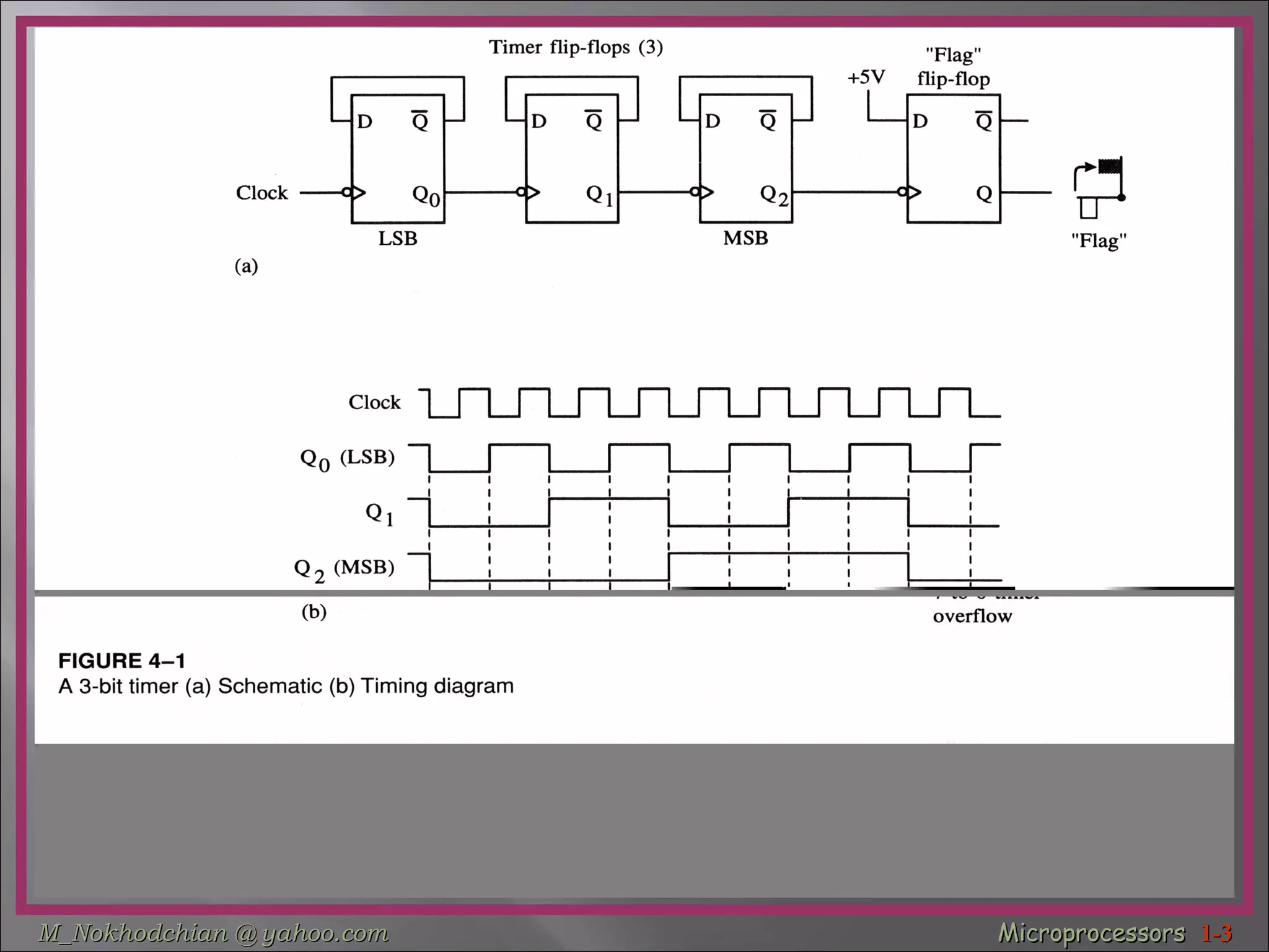 The 8051 startsto count up by incrementing the TH0-TL0 . TH0-TL0= FFFCH,FFFDH,FFFEH,FFFFH,0000H TF = 0 TF = 0 TF = 0 TF = 0 TF = 1 TH0 TL0 Start timer Stop timer Monitor TF until TF=1 TR0=1 TR0=0 TF FFFC FFFD FFFE FFFF 0000