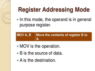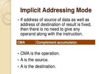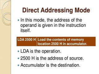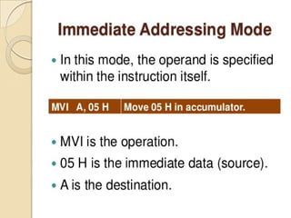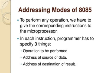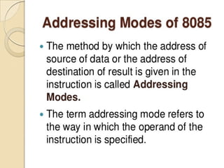 This document discusses the addressing modes of the 8085 microprocessor. It introduces the 8085 and describes its key specifications. It then defines addressing modes as the method by which an instruction specifies the address of the source of data or destination of a result. Five addressing modes are described - direct, register, register indirect, immediate, and implicit. The document concludes that the addressing mode depends on the bytes in the instruction and allows the instruction to specify operands and data addresses.