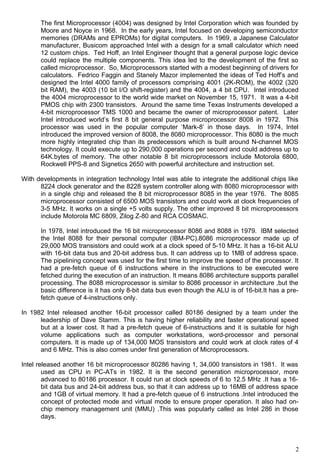 This document provides an introduction to microcomputers and microprocessors. It discusses how a microprocessor is the central processing unit (CPU) of a microcomputer. A microcomputer system consists of a CPU (microprocessor), memory, and input/output devices connected by buses. The document then traces the evolution of microprocessors from the first 4-bit Intel 4004 in 1971 to more advanced 32-bit and 64-bit processors over subsequent decades. It provides details on characteristics of important processors like the Intel 8085, 8086, 80386, and Pentium series. The document concludes with information on the internal structure of the Intel 8085 microprocessor.