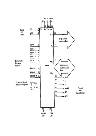 This document provides an overview of the internal architecture and programming of the 8085 microprocessor. It describes the main components of the 8085 including the control unit, arithmetic logic unit, registers, flags, program counter, stack pointer, and buses. It also covers the 8085 pin descriptions and functional details. The document is intended as a tutorial on understanding the 8085 architecture and programming model.