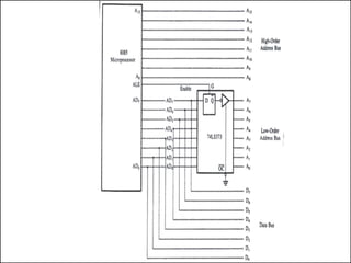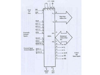 The microprocessor is a programmable device that processes binary numbers according to instructions stored in memory. It contains arithmetic, logic, and control circuits on a single silicon chip. Early processors used discrete components but were large and slow. The invention of the microchip led to much smaller and faster processors by integrating all components onto a single silicon slice. Modern microprocessors manipulate 32-bit or 64-bit words and have instruction sets that define their capabilities. The 8085 was an 8-bit microprocessor that used multiplexed address/data lines, requiring external latching to separate addresses from data.