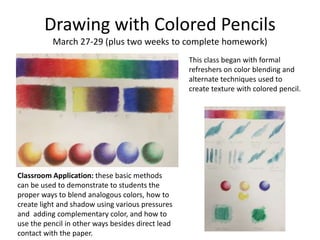 The document outlines a series of art projects completed during a curriculum on drawing, painting, and recycled art for grades K-12, emphasizing techniques and classroom applications. Key projects include still life drawings, acrylic painting exercises, and recycled materials art, with each lesson designed to enhance students' creative expression and technical skills. The presentation provides various classroom applications and further explorations for each project to engage young learners in artistic activities.