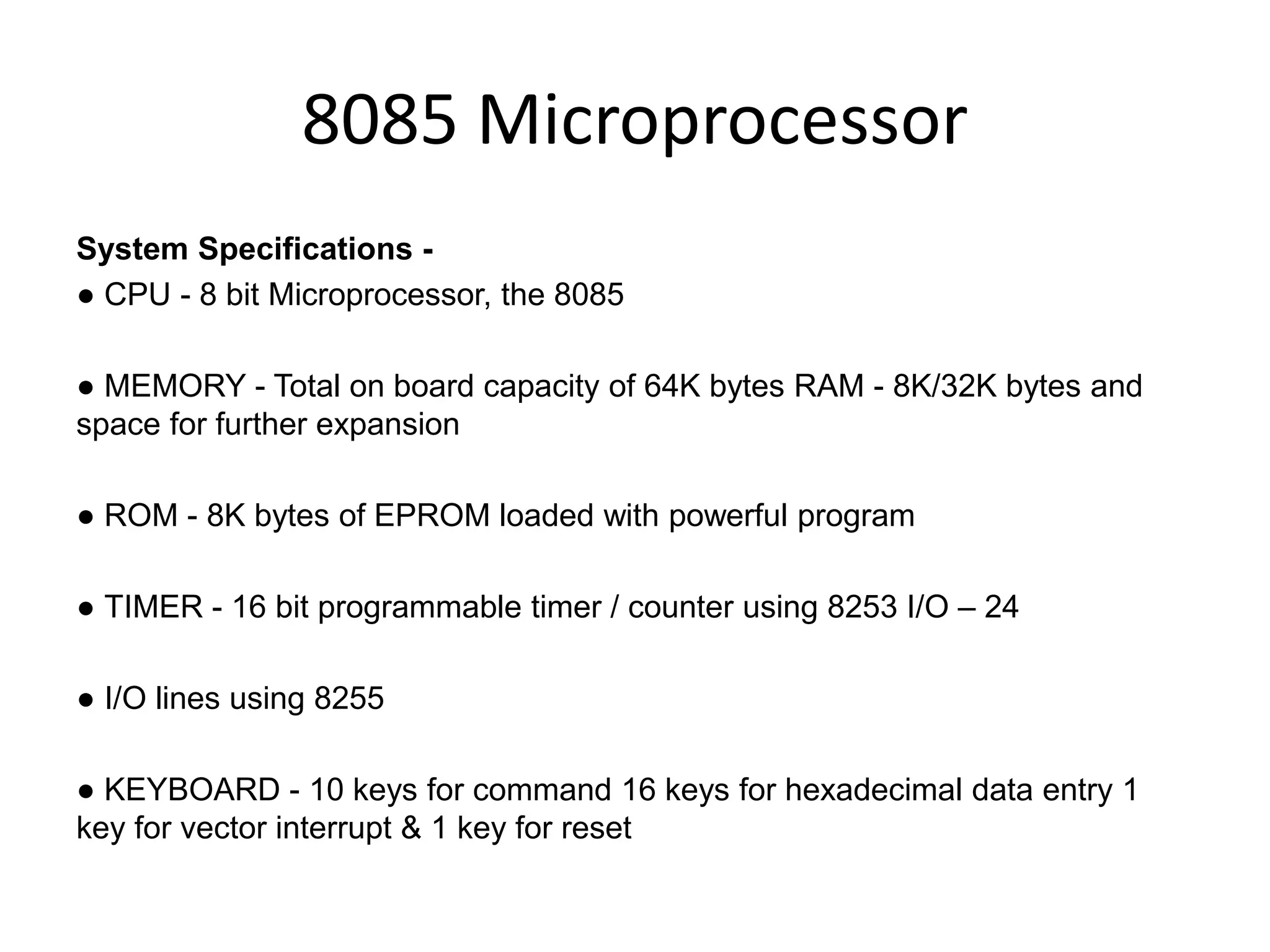 The document describes an 8085 microprocessor system and trainer kit. It includes: