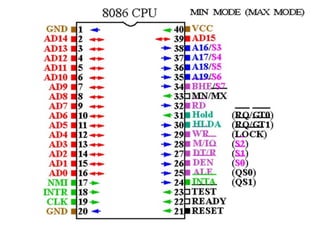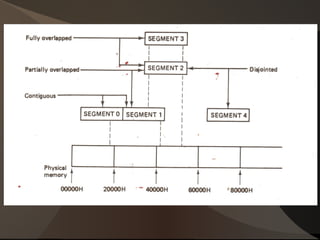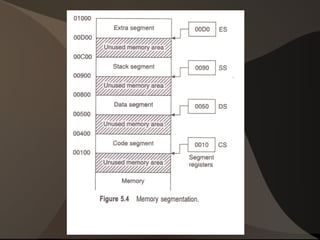 The document provides information on the architecture of the 8086 microprocessor. It describes the Execution Unit (EU) and Bus Interface Unit (BIU) that partition the CPU logic. The EU is responsible for executing instructions while the BIU handles fetching instructions and operands from memory. The EU contains an ALU, registers including general purpose, segment, pointer and index registers, and a flag register. It also describes the various addressing modes supported by the 8086.