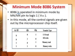 The document discusses the bus structure of the 8086 microprocessor system. It describes the minimum and maximum mode configurations of the 8086. In minimum mode, the 8086 provides all control signals for memory and I/O interfacing. It details the various address, data, status, control and interrupt signals involved. Maximum mode allows for multiprocessor systems by providing additional signals for bus arbitration and shared resources. The timing diagrams of typical read and write cycles are shown for both modes. Coprocessor and closely coupled multiprocessor configurations using the 8086 are also explained.