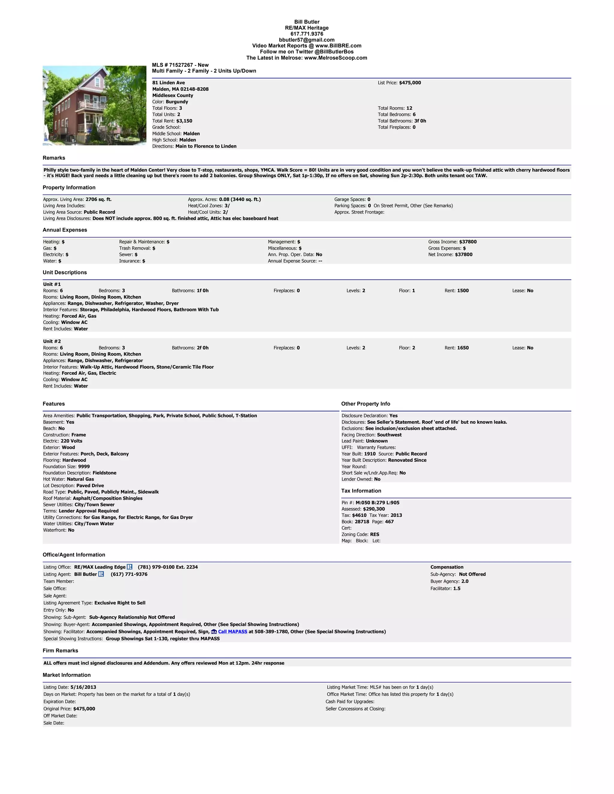 This listing is for a multi-family home with 2 units in Malden, MA that is listed for $475,000. The home has 3 floors and a total of 12 rooms, 6 bedrooms, and 3 bathrooms across its 2 units. Each unit rents for $1,500 and $1,650 respectively, for a total monthly rent of $3,150. The home is in good condition and is located close to public transportation, restaurants, shops and a YMCA. An open house is scheduled for Saturday.