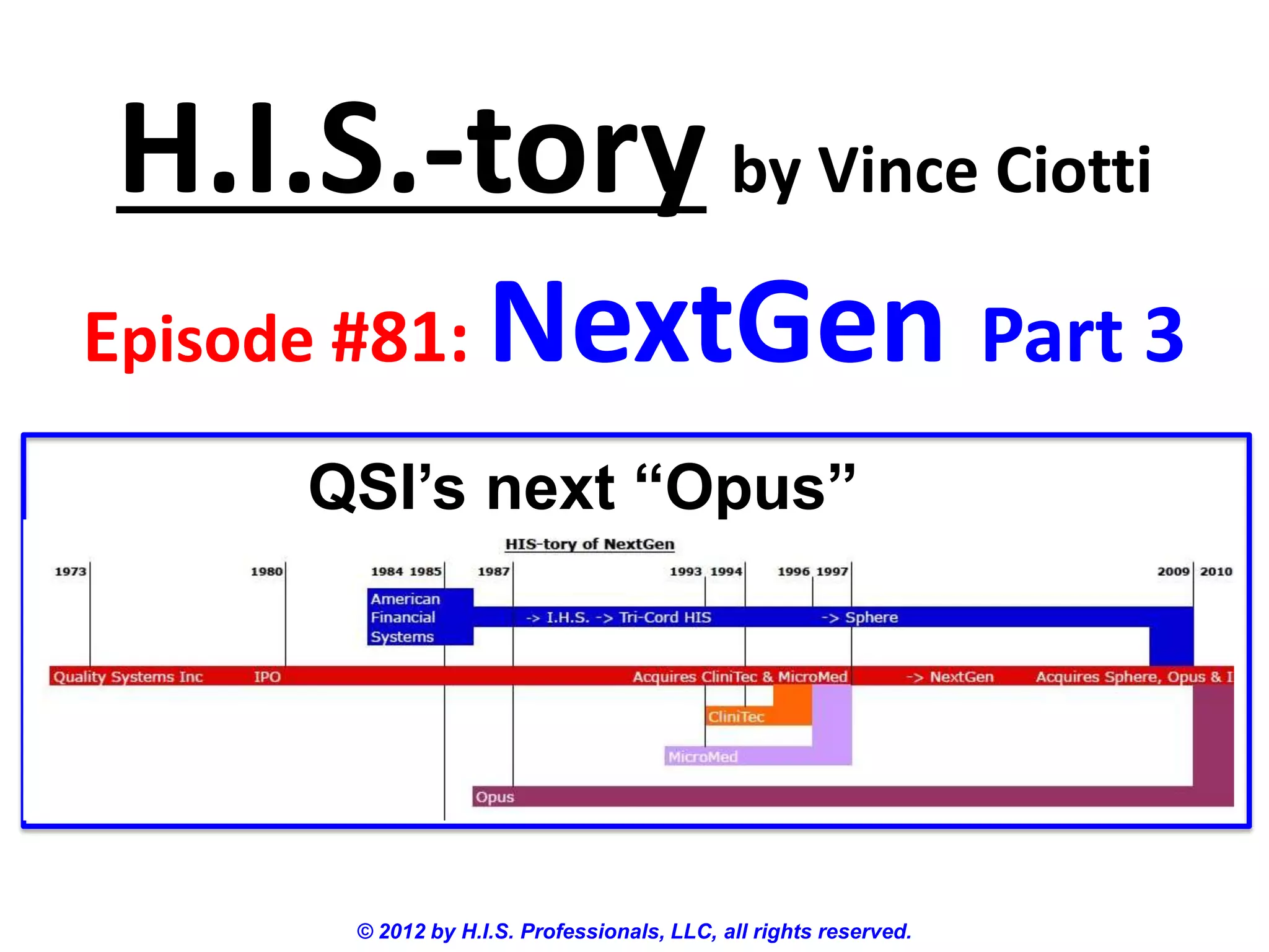 3) In 2010, Opus was acquired by NextGen Healthcare as part of NextGen's strategy to expand into a full-suite hospital information system offering.