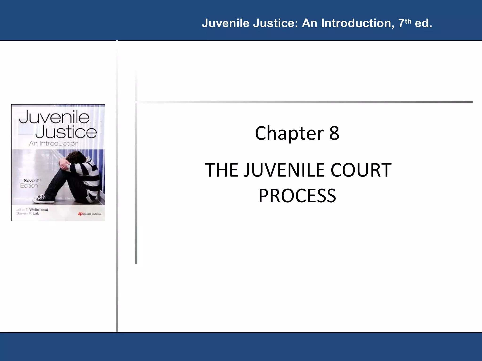 This chapter discusses the juvenile court process. It describes the key decisions made, including detention, intake, adjudication, and disposition. Over 1.6 million delinquency cases were processed in 2007. The detention decision determines whether a juvenile is kept in custody or released. Intake involves deciding whether to file a formal petition or handle the case informally. Cases may also be transferred to adult criminal court. Research shows disproportionate minority contact at various stages and that transferring juveniles to adult court does not effectively prevent crime and may increase recidivism.