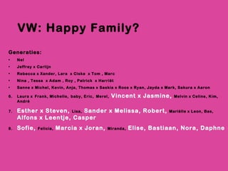 VW: Happy Family?Generaties: Nel Jeffrey x Carlijn Rebecca x Xander, Lara x Ciske x Tom , Marc Nina , Tessa x Adam , Roy , Patrick x Harriët Sanne x Michel, Kevin, Anja, Thomas x Saskia x Roos x Ryan, Jayda x Mark, Sakura x Aaron 6. Laura x Frank, Michelle, baby, Eric, Merel, Vincent x Jasmine, Melvin x Celine, Kim, André 7. Esther x Steven, Lisa, Sander x Melissa, Robert, Mariëlle x Leon, Bas, Alfons x Leentje, Casper 8. Sofie, Felicia, Marcia x Joran, Miranda, Elise, Bastiaan, Nora, Daphne