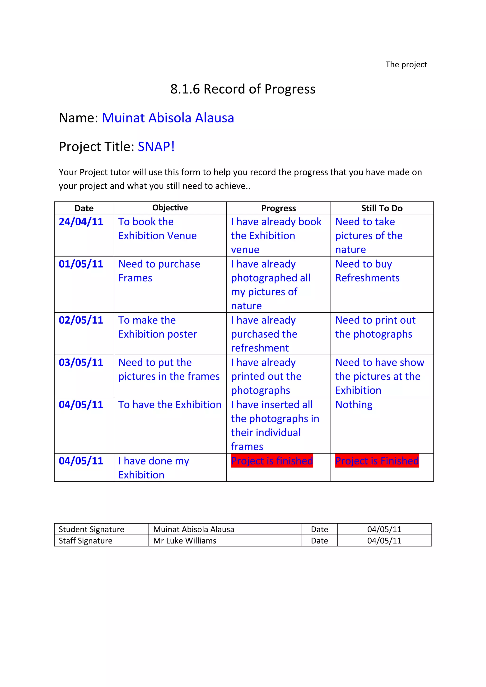 This document is a record of progress for a student's photography exhibition project. It outlines the objectives, progress made, and remaining tasks for each date leading up to the exhibition. Key dates include booking an exhibition venue in April, purchasing frames and refreshments in May, creating exhibition posters, framing photographs, and finally holding the successful exhibition on May 4th where all tasks were completed.