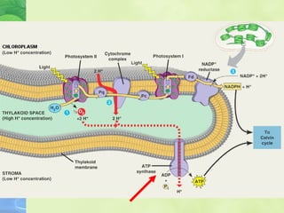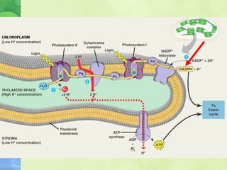 Photosynthesis allows plants to convert sunlight, carbon dioxide and water into glucose and oxygen. It occurs in two phases within the chloroplast - the light dependent reactions where ATP and NADPH are produced, and the light independent Calvin cycle where glucose is assembled from carbon dioxide using ATP and NADPH. The overall equation is carbon dioxide + water + energy (sunlight) → glucose + oxygen.