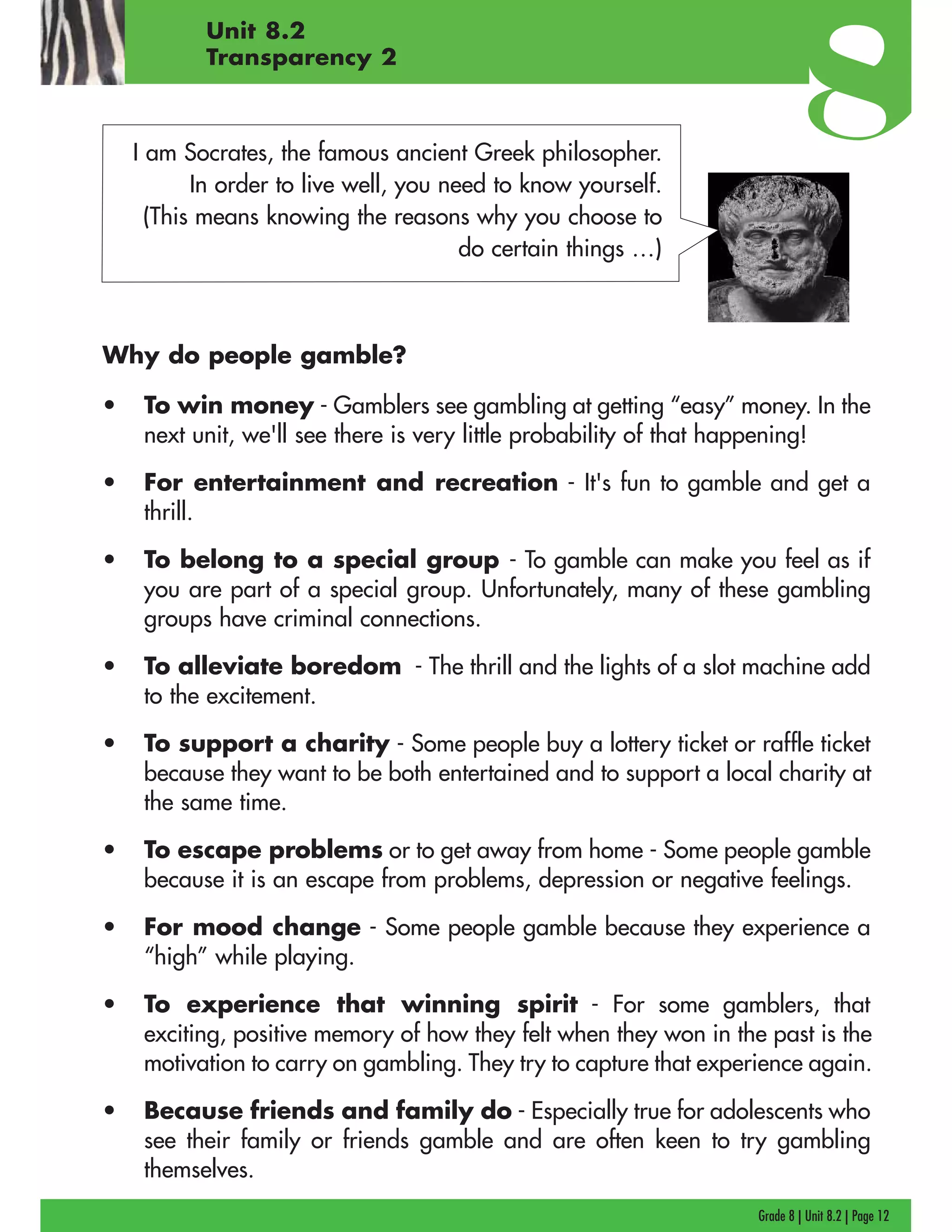 People gamble for a variety of reasons: to win money, for entertainment, to belong to a social group, to alleviate boredom, to support charities, to escape problems, for mood change, to experience winning, and because of social influences from friends and family. Understanding the motivations behind gambling is important for making wise choices.