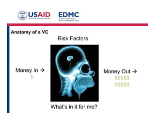This presentation discusses the anatomy of a venture capital investment from the perspective of a venture capitalist. It notes that VCs typically only fund about 1% of the startup companies they review each month. When considering an investment, VCs evaluate factors like how much funding is required, the company's traction and milestones, potential exits, and risks. Major risk factors include issues with the team, market, competition, technology, and legal or IP concerns. The goal for VCs is achieving a high return exit through an acquisition or IPO.