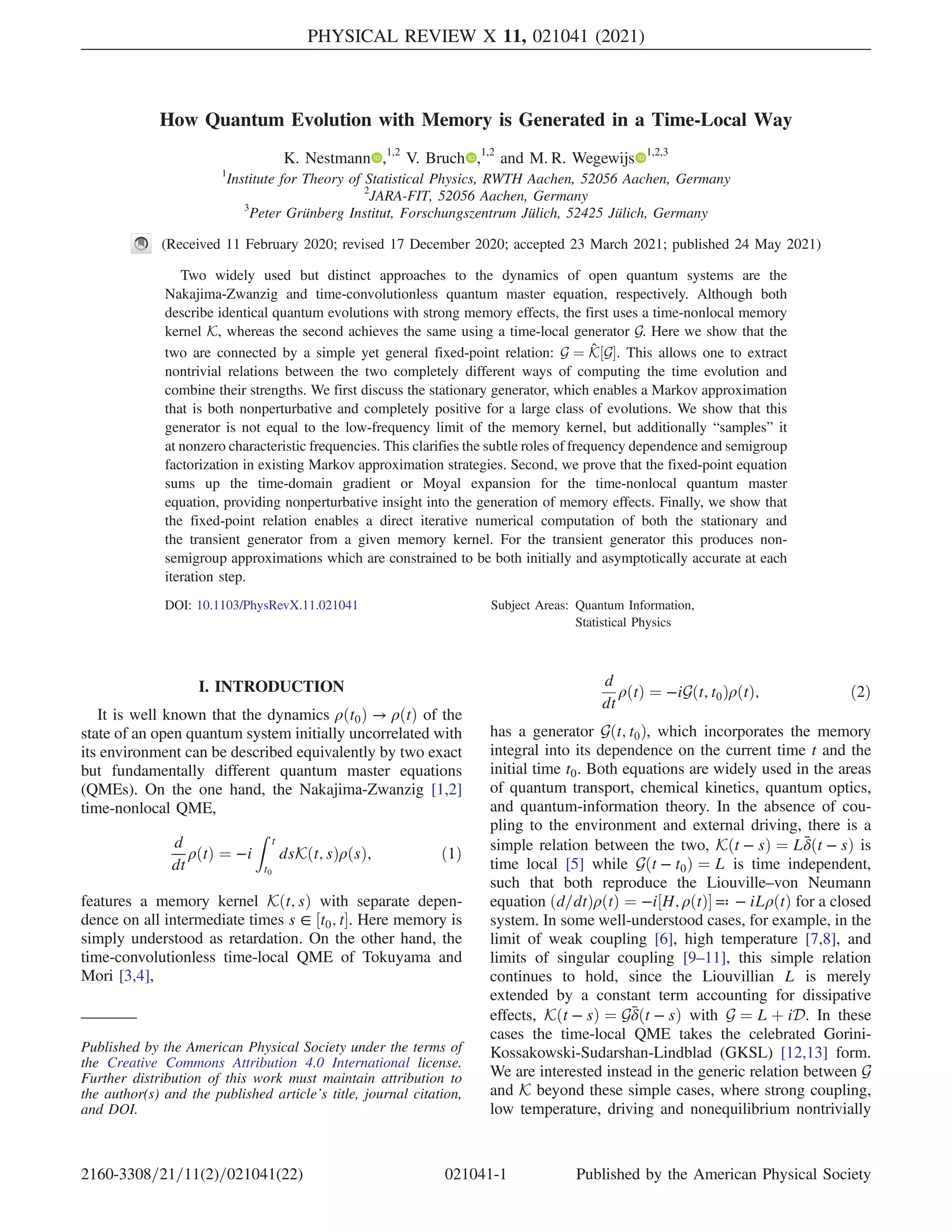 This document discusses the relationship between two approaches to modeling the dynamics of open quantum systems - the Nakajima-Zwanzig time-nonlocal quantum master equation and the time-convolutionless time-local quantum master equation. It is shown that these two descriptions are connected by a simple fixed-point relation, where the time-local generator G is equal to the memory kernel K applied to G. This fixed-point relation allows insights into both the stationary and transient dynamics, providing a nonperturbative understanding of how memory effects are generated in the time-local description from the time-nonlocal memory kernel.
