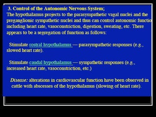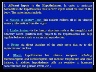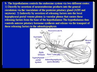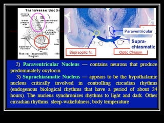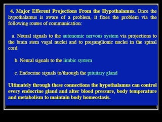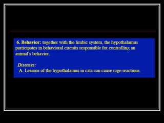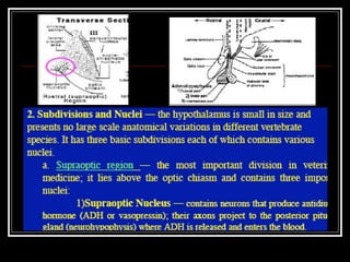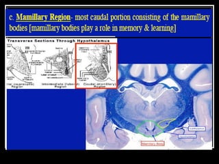 The document discusses the diencephalon, which is a region of the brain situated between the cerebrum and brainstem. It consists of four main parts: the thalamus, hypothalamus, epithalamus, and subthalamus. The thalamus acts as a gateway to the cerebral cortex by integrating sensory information and influencing mood and emotions. The hypothalamus regulates vital functions such as body temperature, hunger, and circadian rhythms. Examville.com is an online learning site that offers practice tests, classes, tutoring, study guides, and premium content to help students prepare for exams.