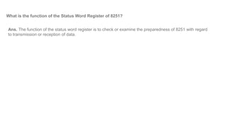 The document details the structure and functions of the 8251 microcontroller, highlighting its sections such as the transmitter and receiver, along with their control logic. It explains the roles of various registers, how data transmission occurs, and the need for modems in digital data transmission. Modems convert digital signals to audio tones for transmission over analog lines, enabling effective communication between devices.