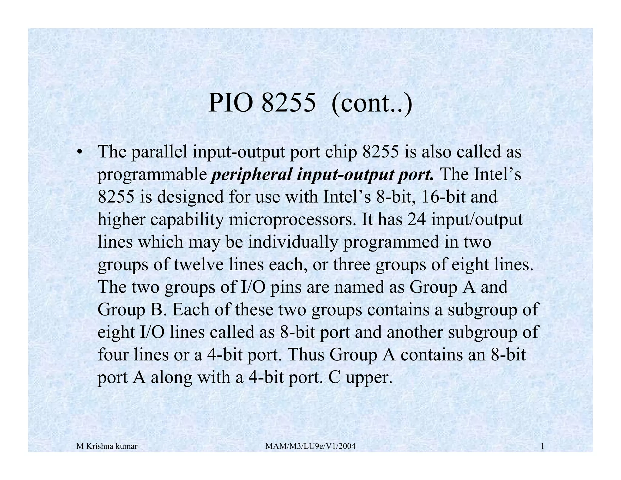 The document discusses the Intel 8255 programmable peripheral interface chip. It has 24 I/O lines that can be configured as 3 ports (A, B, C) of 8 lines each or in other combinations. Ports A and B are 8-bit ports while port C can be used as two 4-bit ports or combined as an 8-bit port. The chip contains control logic and registers that allow the ports to be individually programmed as inputs or outputs. It connects to the data bus and can be addressed by a microprocessor to read/write data or control registers.