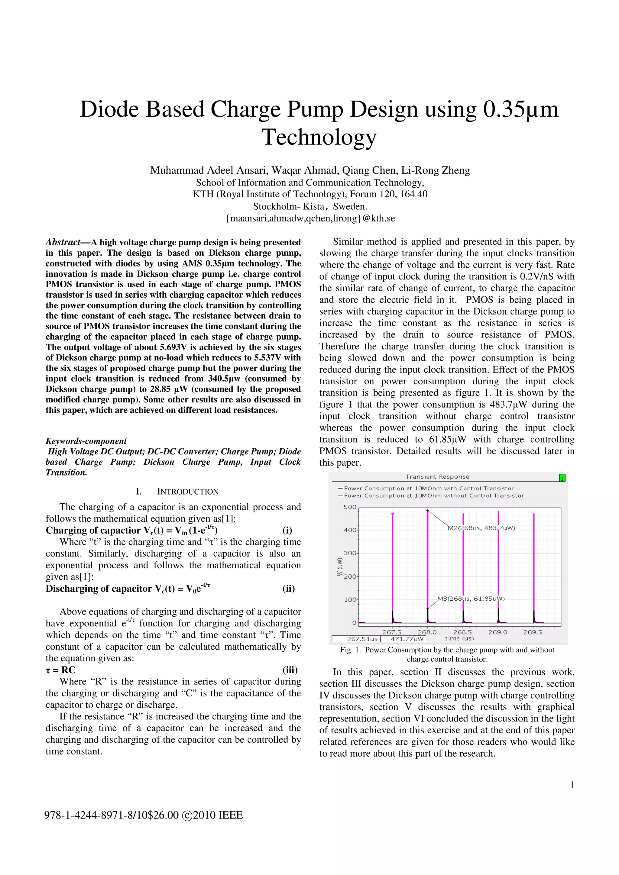 The document describes a modified Dickson charge pump design that reduces power consumption during input clock transitions. A PMOS transistor is added in series with each capacitor stage to increase the time constant, slowing the charge transfer. This reduces power from 340.5uW to 28.85uW at no load for the Dickson versus modified design. Output voltages are similar but slightly lower for the modified design. At 10MOhm and 40MOhm loads, power savings during transitions are also realized compared to the standard Dickson design while maintaining comparable output voltages. In conclusion, the modified design successfully reduces transition power consumption without significantly impacting output voltage.