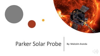 The Parker Solar Probe spacecraft launched in August 2018 to study the sun through direct measurements of its corona. It will make multiple close approaches to within 4 million miles of the sun's surface, closer than any other spacecraft, to provide new data on solar activity and help understand processes that drive solar wind. The spacecraft carries instruments to measure the solar wind, magnetic and electric fields, and take images of the corona to analyze properties of the sun's atmosphere.