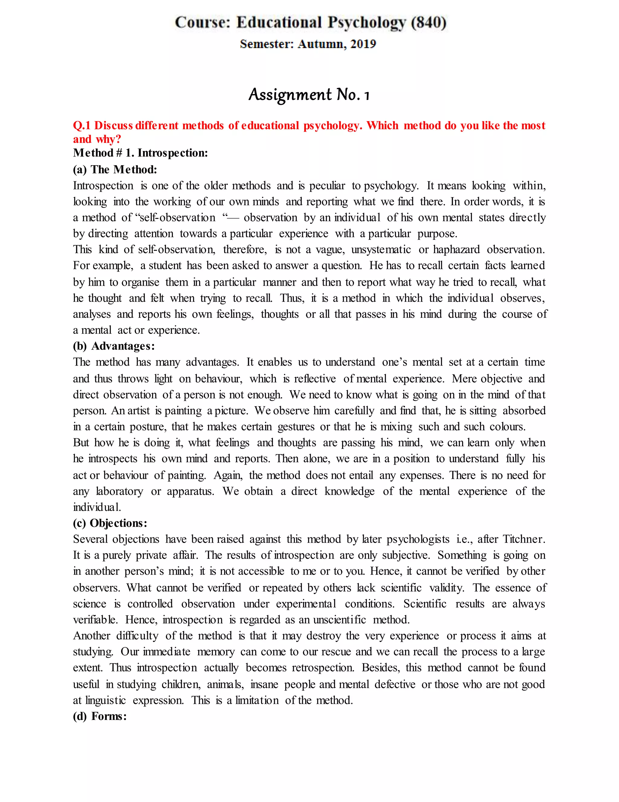 1) Introspection involves self-observation but has limitations as results cannot be verified by others. The observational method observes behavior objectively but subjects may act unnaturally. The experimental method uses control groups to test hypotheses scientifically.