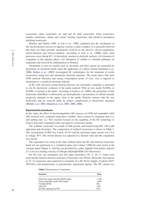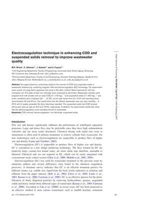 This document summarizes a study that examined using electrocoagulation (EC) to remove chemical oxygen demand (COD) and suspended solids from wastewater. The researchers conducted batch experiments using iron electrodes and varying current, treatment time, and settling time. They found that EC was effective at removing COD and suspended solids from synthetic wastewater made from milk powder. Increasing the treatment time increased pH and improved removal of COD and turbidity. After 30 minutes of settling, the treated wastewater quality exceeded discharge standards with low turbidity and high removal of COD and suspended solids.