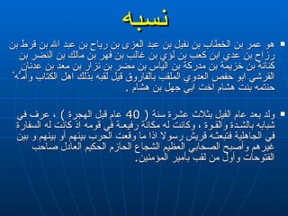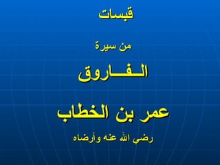 عمر بن الخطاب رضي الله عنه هو أحد أعظم صحابة النبي محمد صلى الله عليه وسلم، ولد بعد عام الفيل بثلاث عشرة سنة، وعُرف بشجاعته وحكمته، وأسلم في السنة السادسة من البعثة النبوية. ولقب بـ 'الفاروق' بسبب دوره في التمييز بين الحق والباطل، وهو أحد العشرة المبشرين بالجنة ووزير الرسول صلى الله عليه وسلم من أهل الأرض. عُرف بإنجازاته في الفتوحات الإسلامية وعدل حكمه الذي أسهم في تعزيز الإسلام بشكل كبير.
