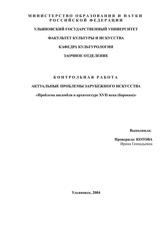 Документ освещает развитие стиля барокко в архитектуре XVII века, начиная с его корней в итальянском искусстве до его влияния в других странах Европы. Основные фокусные точки включают работы таких архитекторов, как Джованни Лоренцо Бернини и Франческо Борромини, подчеркивающие динамичность и эмоциональность барокко. Фактически, стиль отражает контрреформационные тенденции католической церкви, в то время как его интерпретации варьировались в зависимости от местных традиций.