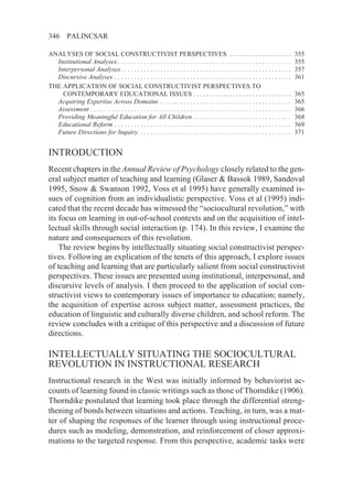 This document provides an overview of social constructivist perspectives on teaching and learning. It discusses how social constructivism views learning as dependent on social and cultural factors, in contrast to earlier behavioral and cognitive perspectives that viewed learning as an individual process. The document reviews theories from Piaget and Vygotsky that inform social constructivist views of learning mechanisms. It also examines research applying social constructivism through institutional, interpersonal, and discursive analyses of teaching and learning processes. Finally, it discusses applications of social constructivism to issues like expertise development, assessment, education equity, and school reform.