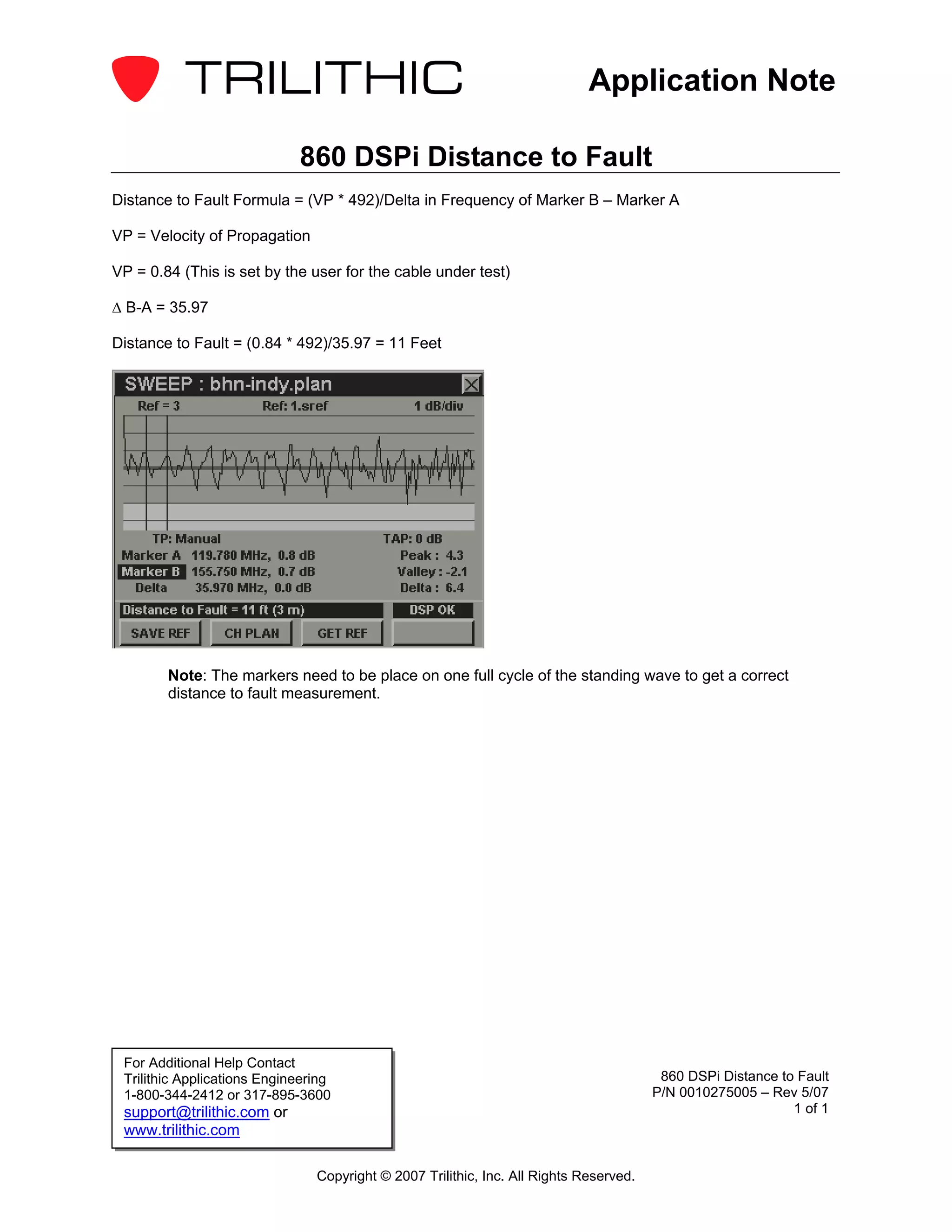 This document provides an example calculation for determining distance to fault using an 860 DSPi device. The distance to fault formula uses the velocity of propagation and difference in frequency between two markers on the standing wave pattern. In the example, with a velocity of 0.84 and a frequency difference of 35.97, the calculated distance to fault is 11 feet. A note indicates the markers need to be placed on a full cycle of the standing wave for an accurate measurement.