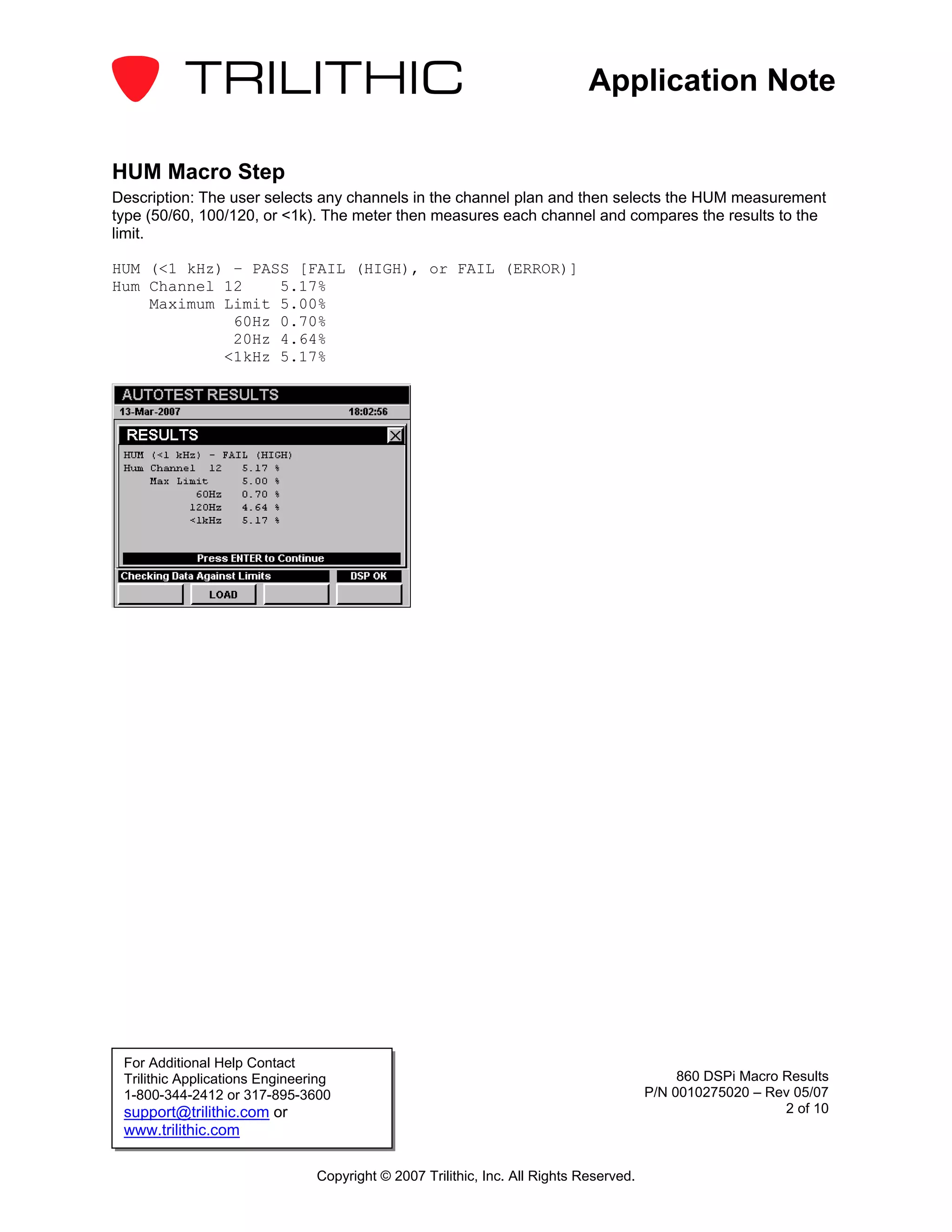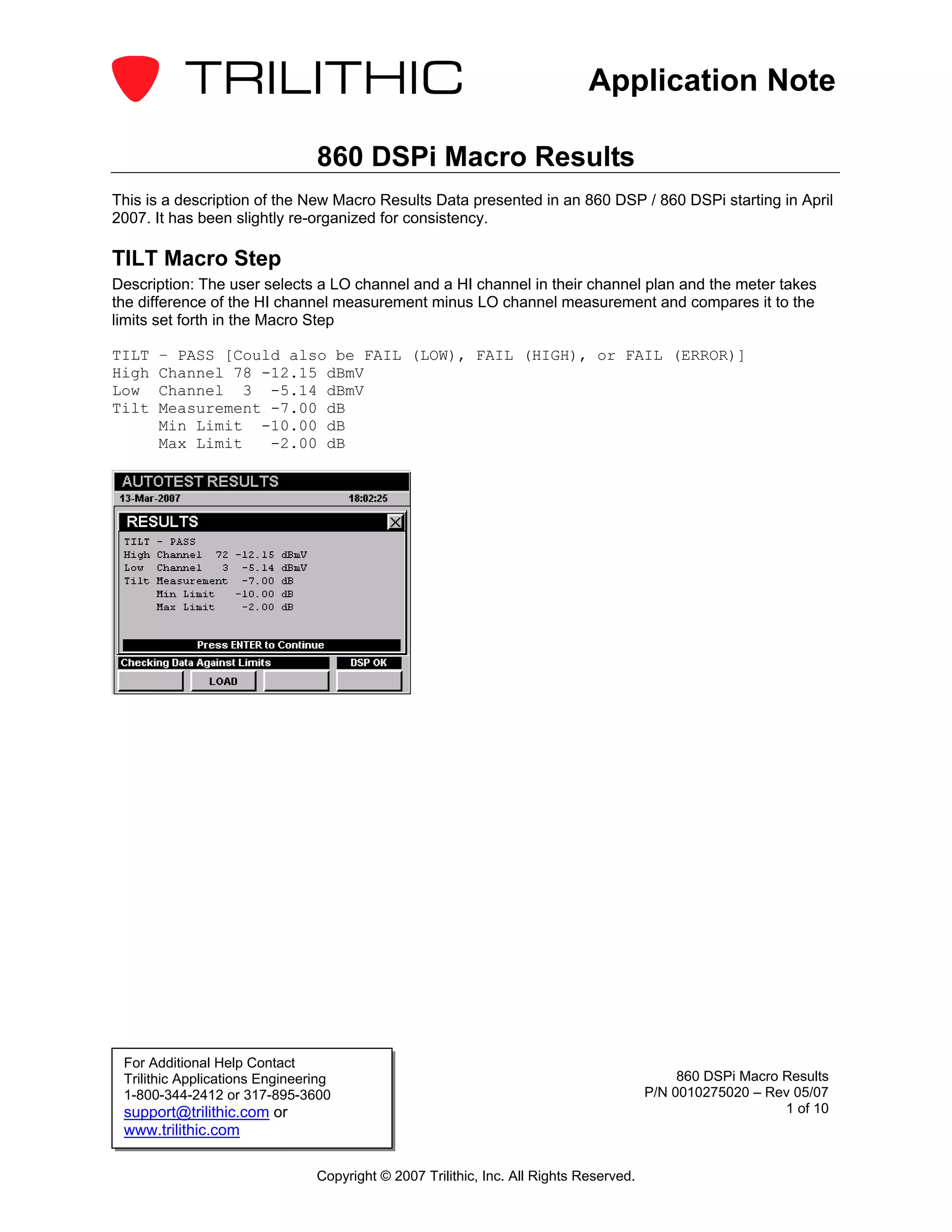 This document describes the macro results that can be presented on an 860 DSP/860 DSPi cable tester. It explains each of the macro steps for measurements like Tilt, HUM, C/N, QAM, Scan, Spectrum, Ping, Throughput, VOIP-RTP, CMSTAT and Leakage and provides examples of results that would indicate a pass or different types of failures.