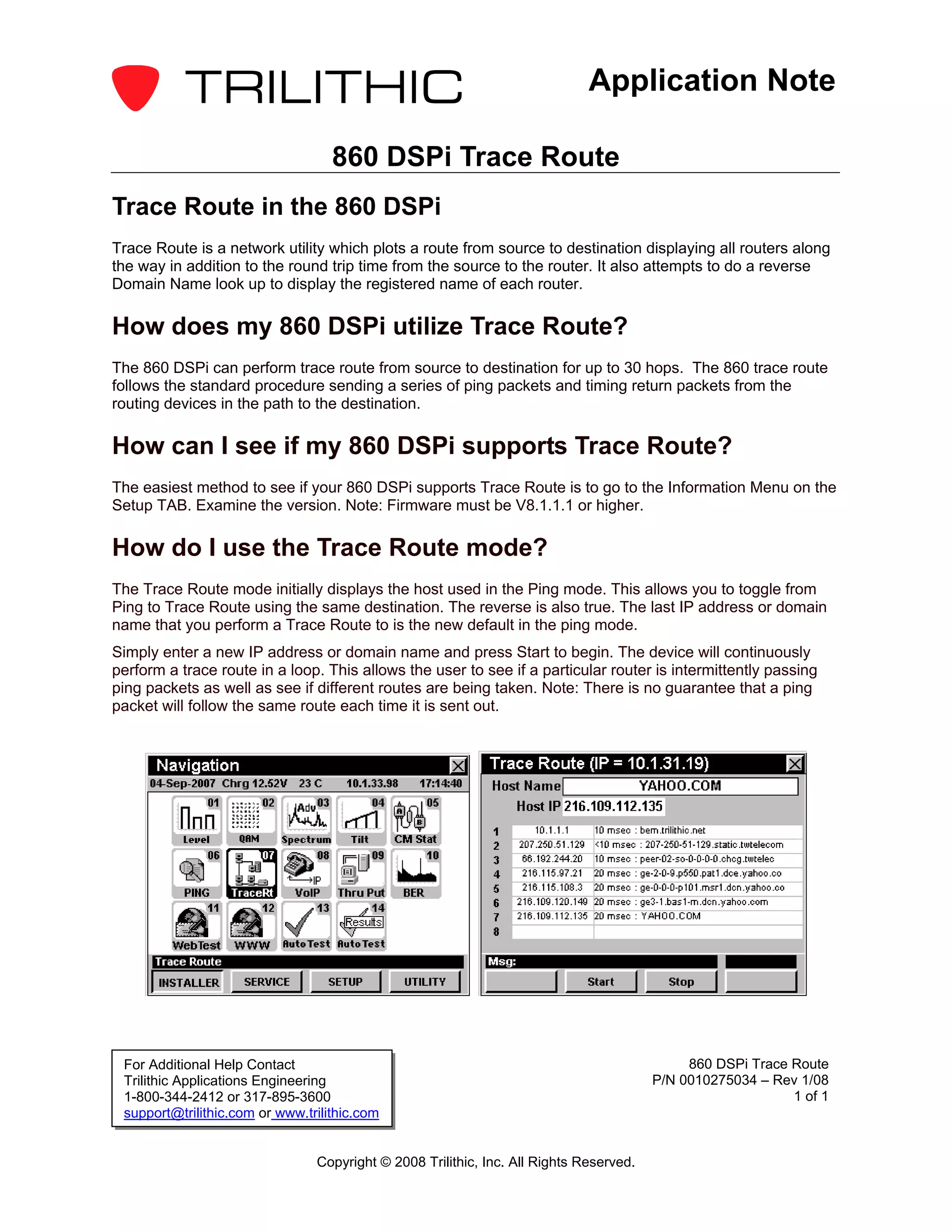 The document discusses how to use the trace route function on the 860 DSPi device. It explains that trace route plots the route from source to destination by displaying routers along the way and their response times. The 860 DSPi can perform trace routes of up to 30 hops by sending ping packets and timing responses. To check if a device supports trace route, view the firmware version in the information menu - version 8.1.1.1 or higher is required. The mode allows entering an IP or domain to begin tracing the route, and will continuously loop for monitoring.