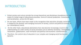 This document discusses key concepts related to society, culture, and education. It defines society as a group of people related through shared relationships, geography, and culture. Social structure establishes patterns of social relationships to regulate interactions according to cultural norms. Education is shaped by society and culture, and also plays a central role in understanding social processes like identity formation. The functions of education are to develop individuals' potential and personality, prepare them for the future, and benefit society through social change, developing shared values, and national development like leadership and integration.
