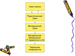 Документ описывает организацию методической работы в школе № 865, включая создание различных методических объединений и творческих микрогрупп для учителей разных предметов. Основное внимание уделяется внедрению прогрессивных педагогических технологий, преемственности в обучении и совместной работе с молодыми специалистами. Структура включает данные о составе групп и руководителях, а также направлениях работы в каждой из областей образовательного процесса.