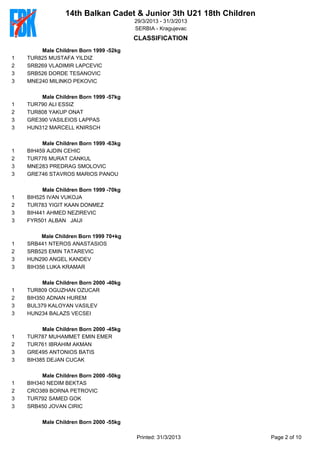 This document provides results from the 14th Balkan Cadet & Junior 3th U21 18th Children tournament held from March 29-31, 2013 in Kragujevac, Serbia. It lists winners and placement in various categories including Cadet and Junior Kumite and Kata for males and females in different age groups and weight classes, as well as results for team competitions.