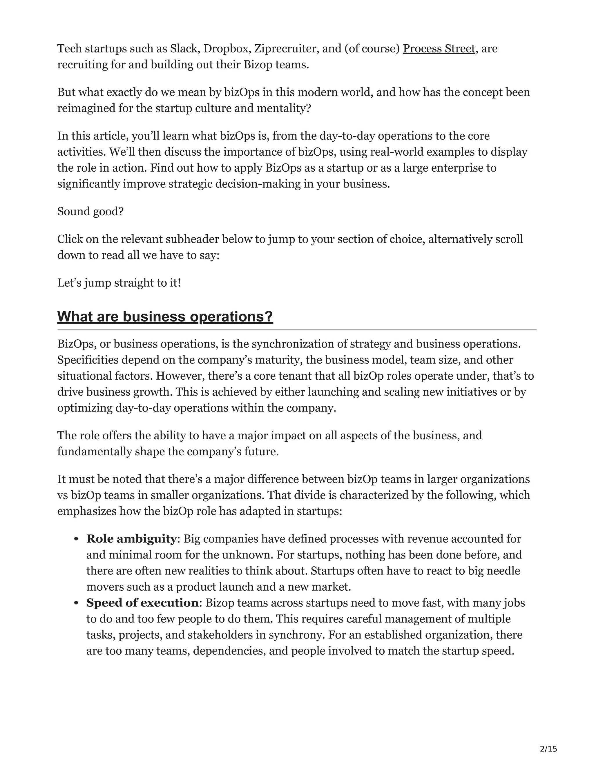 The document discusses the critical role of business operations (bizops) in enhancing strategic decision-making and operational efficiency within organizations, highlighting that 89% of executives believe it significantly aids in aligning investments with business goals. Differences in bizops practices between startups and larger organizations are emphasized, particularly in terms of role ambiguity, speed of execution, learning curves, and scope of responsibilities. It also explores various tasks and metrics used by bizops personnel to optimize performance and drive business growth, alongside showcasing real-world applications from companies like LinkedIn and Process Street.