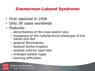 This document describes the orthodontic and surgical management of Zimmerman-Laband Syndrome. Zimmerman-Laband Syndrome is a rare genetic condition characterized by abnormalities of the nose and ears, nail and digit abnormalities, gingival fibromatosis, delayed dental eruption, skeletal anterior open bite, enlarged palatal rugae, and learning difficulties. The treatment plan involved upper and lower fixed appliances, 6mm posterior maxillary impaction with mandibular autorotation, finishing orthodontics, and retention with upper and lower retainers. Pre-treatment, post-operative, post-surgical, and debond photographs and radiographs are presented to document the treatment and outcomes.