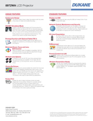 The Dukane 8972WA LCD projector is designed for mid to large venues, offering 4,000 ANSI lumens brightness and WXGA 1280 x 800 resolution for brilliant image quality. It includes features like multiple lens options, motorized zoom and focus, and advanced connectivity such as USB and networking capabilities, making it user-friendly for diverse applications. With a robust warranty and service support, the projector ensures reliability and performance efficiency for various presentation needs.
