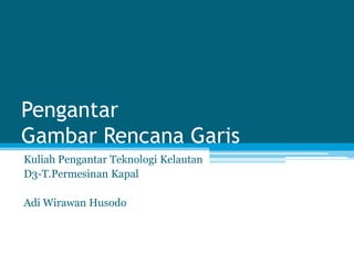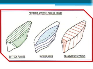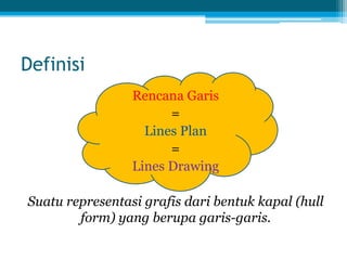 Dokumen ini membahas tentang rencana garis kapal, yang merupakan representasi grafis dari bentuk lambung kapal. Rencana garis menunjukkan potongan lambung kapal pada tiga bidang ortogonal yaitu buttock planes, water planes, dan transverse section. Dokumen ini juga menjelaskan tabel offset yang berisi ukuran-ukuran bagian melintang kapal yang digunakan untuk mengetahui dimensi sebenarnya kapal.