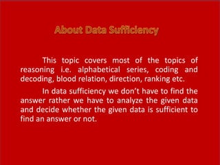 This document discusses data sufficiency reasoning questions. It provides examples of 5 questions with explanations of the type of data provided in statements I and II and the correct answer. For example, one question asks who scored highest among 5 people. Statement I provides part of the ranking, and statement II provides the rest. Together the statements are sufficient but neither alone, so the answer is 5. The document aims to help understand the concept of data sufficiency and practice answering questions determining if data in 1 or both statements is sufficient to answer the given question.