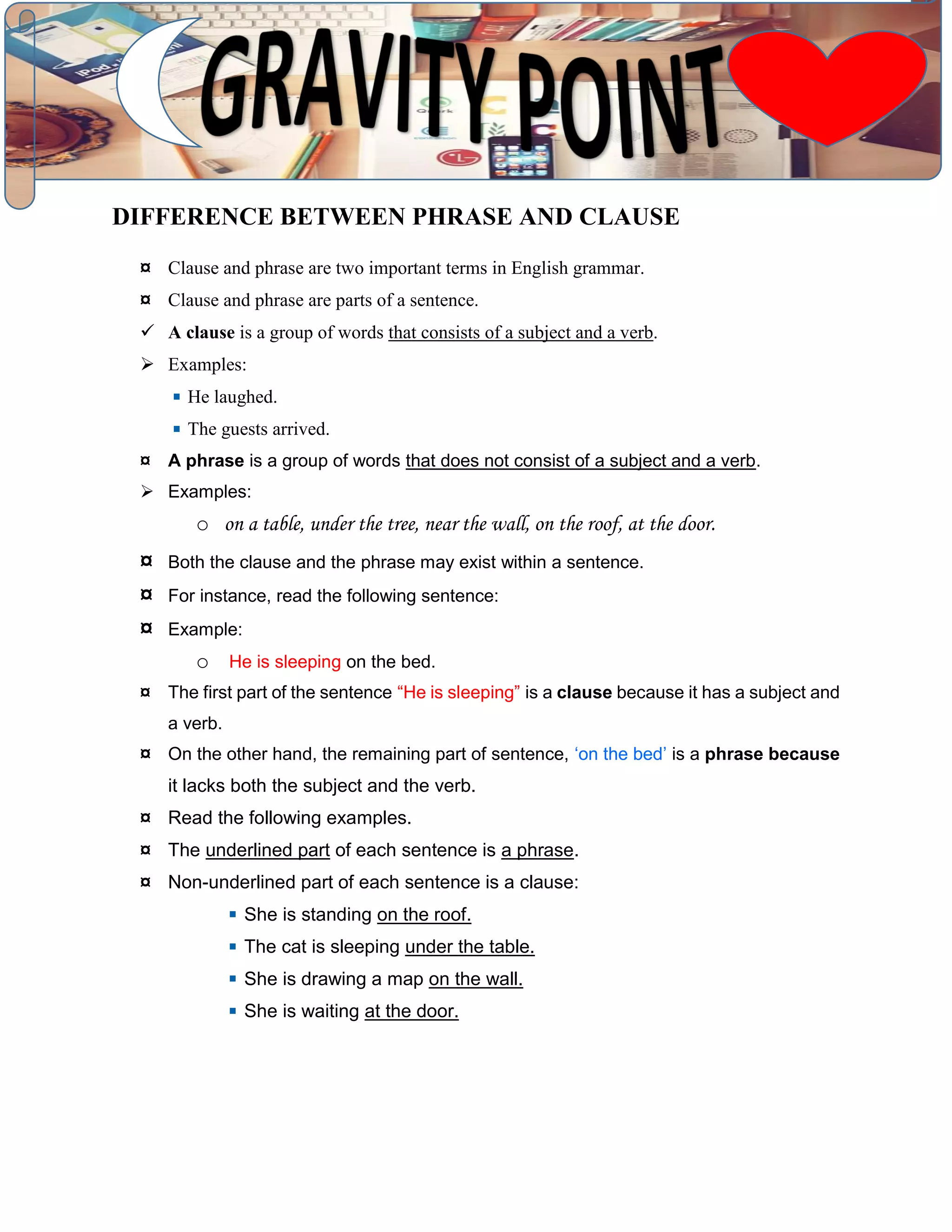 A clause contains both a subject and a verb and can stand alone as a complete sentence, while a phrase lacks both a subject and verb and cannot stand alone. The difference between a clause and phrase is that a clause provides a complete meaning on its own, like "He is sleeping", while a phrase does not, like "on the bed". A sentence can contain both clauses and phrases.