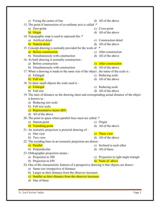 The document contains questions about drawing techniques and drafting tools. It covers topics like orthographic projection, isometric drawing, dimensioning, scales, perspective drawing, and the use of tools like T-squares, protractors, and French curves. The questions test knowledge of key concepts in technical drawing like different types of projections, scales and dimensions, drafting equipment, and conventions for hidden lines and section views.