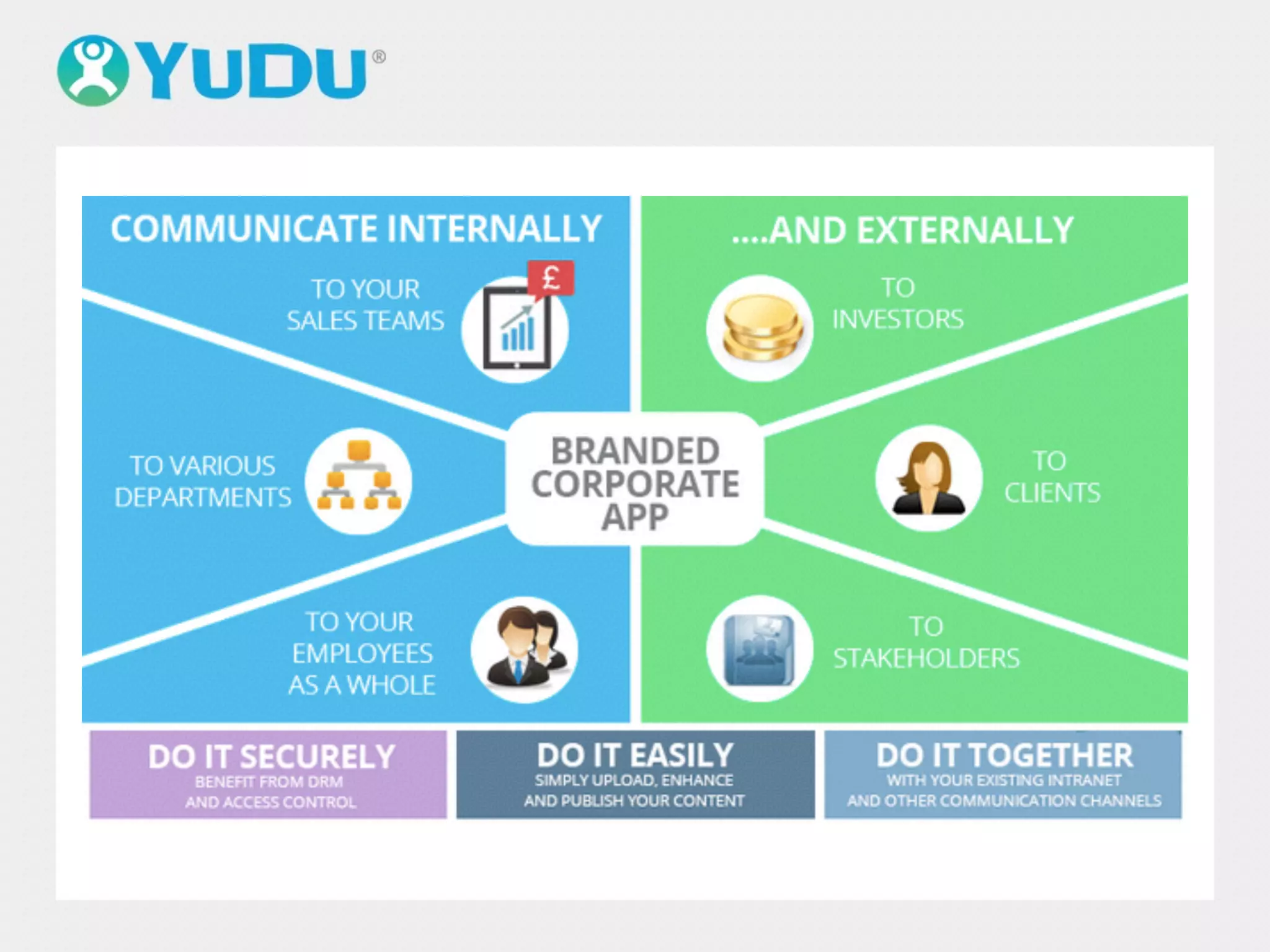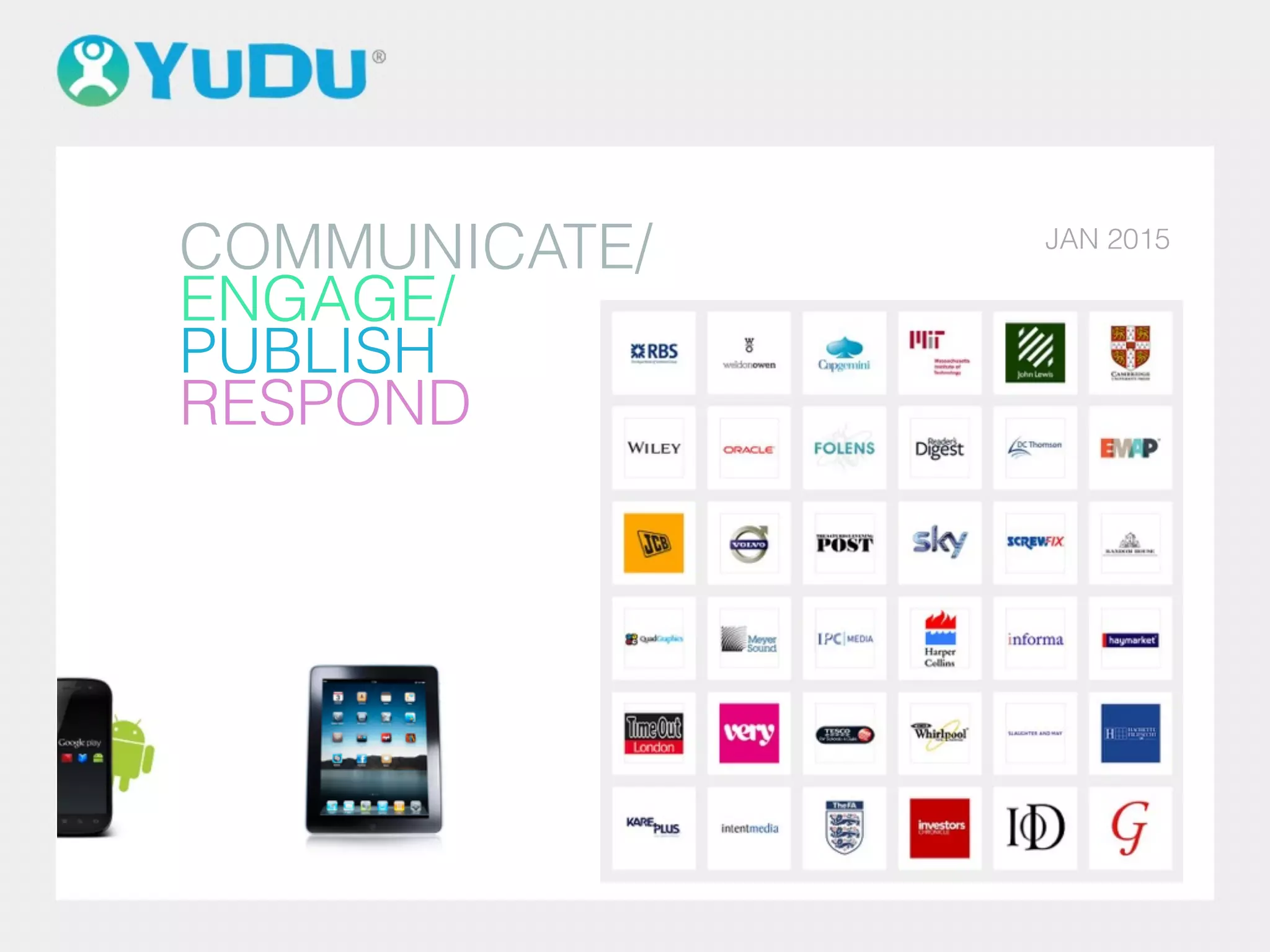 The document discusses Yudu's mobile app publishing platform. It provides an overview of Yudu's services, including creating customized mobile apps for communication and content distribution, managing and publishing content to apps from their cloud portal, and offering support for app development, maintenance, and user experience. Key features mentioned are cross-device access, content security and version control, analytics and permissions tools, and options for public, private, or gated app distribution models. Examples of clients and solutions are also summarized.