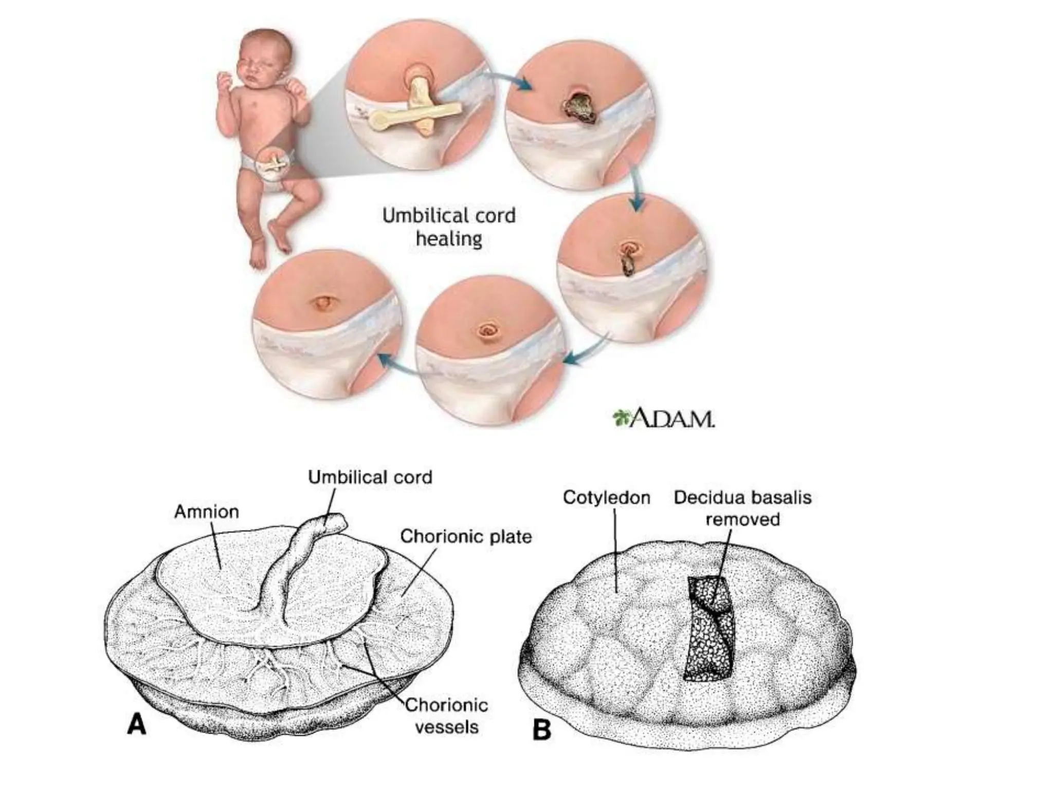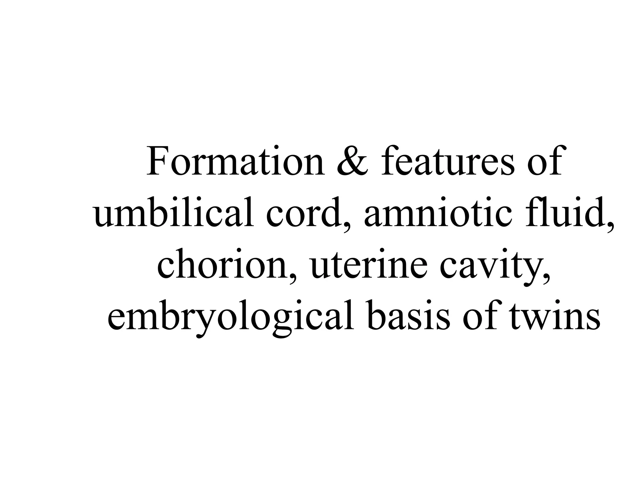 The document discusses the formation and features of the umbilical cord, amniotic fluid, and the embryological basis of twins, detailing structures like the connecting stalk and characteristics of the umbilical cord. It outlines the significance of amniotic fluid, including its average volume, functions, and associated conditions like oligohydramnios and polyhydramnios. The document further explains the types of twinning, including dizygotic and monozygotic twins, along with their anatomical configurations and potential complications during pregnancy.