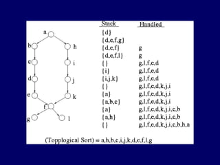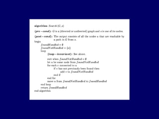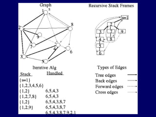 The document discusses different representations of graphs and algorithms for traversing graphs. It describes adjacency matrices and adjacency lists for representing graphs, with adjacency matrices using O(V^2) space and lists using O(V+E) space. It then explains depth-first search (DFS) and breadth-first search (BFS) traversal algorithms, with DFS implemented recursively using a stack and BFS using a queue to visit nodes level-by-level. The relation between DFS and BFS is that they both maintain an edge list but DFS removes from the end like a stack while BFS removes from the beginning like a queue.