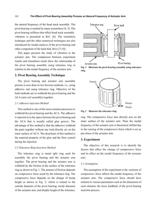 The document summarizes a study on how the process of assembling the pivot bearing affects the natural frequency of actuator arms in hard disk drives. The experiment varied the inside diameter of actuator arms and measured the installation force and natural frequencies after assembling with pivot bearings and tolerance rings. Results showed modes 4 and 5 had significantly different frequencies that correlated with installation force and bore size. Finite element modeling agreed with experimental results. In conclusion, the pivot bearing assembly process, particularly the compressive force from tolerance rings, impacts some vibration modes of the actuator arm.