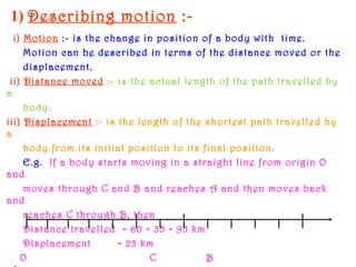 1) The document describes various concepts related to motion including distance, displacement, speed, velocity, uniform and non-uniform motion, acceleration, and graphical representations of motion using distance-time and velocity-time graphs.
