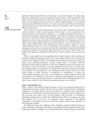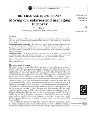 This document discusses issues related to salaries and managing turnover among librarians. It notes that librarians tend to share salary information with one another, which can negatively impact recruitment and retention when salaries are too low compared to the market. The document suggests that while factors like workplace culture and job satisfaction are important, salary is often the primary reason why librarians leave positions. It warns that when pay is inadequate, it can spread discontent among current employees and damage an institution's reputation as an employer. Managing pay competitiveness and addressing pay issues proactively are presented as important strategies for retaining talent.
